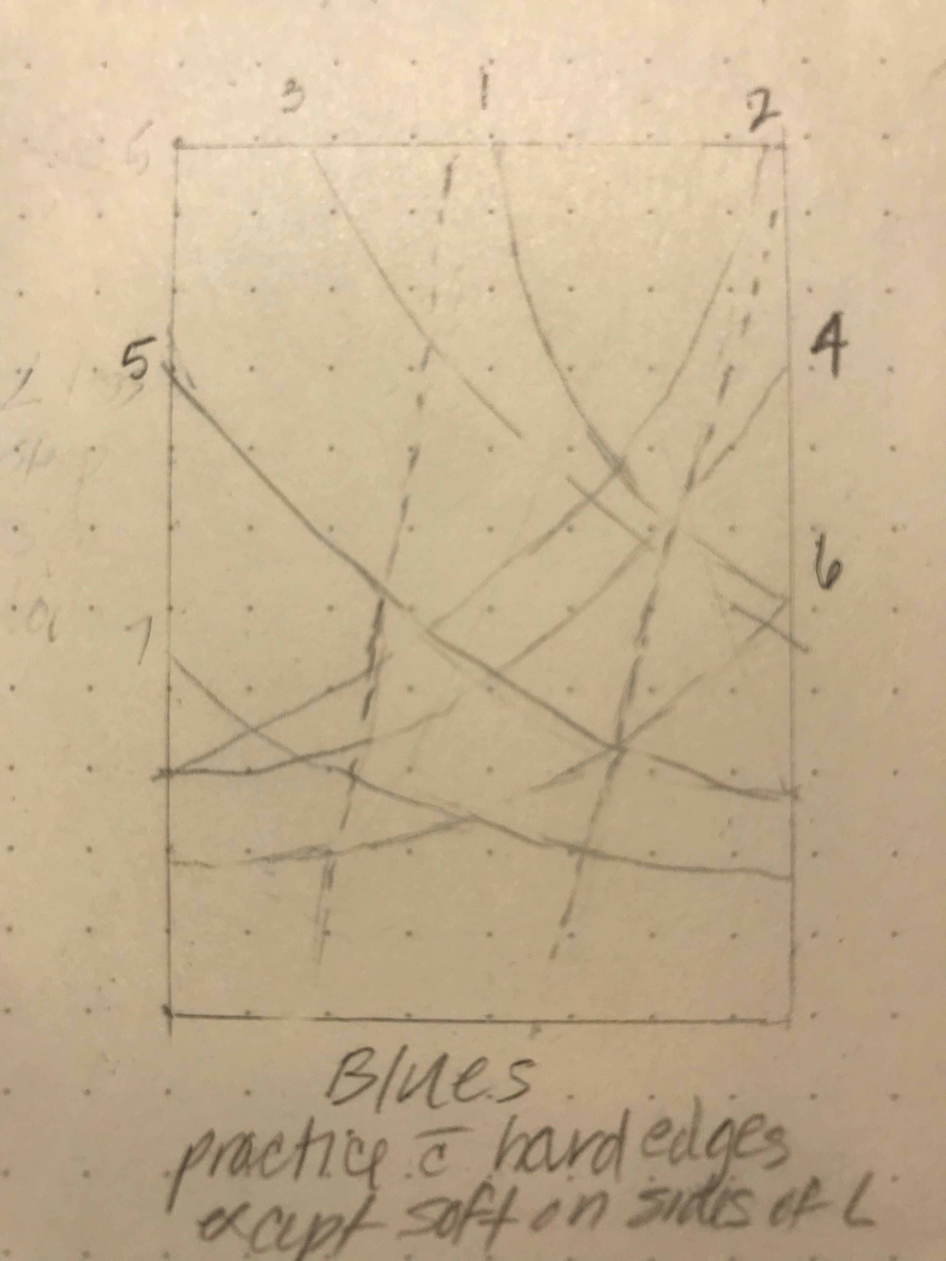 The diagram for the first blue exercise we did today is included with the handouts. We did the first 4 washes working down from the top in class today. If you would like, you could do the next 2 washes a little darker and the final one at the bottom a little darker still. (You could reference my diagram or feel free to create your own concave gestures.) All these washes have hard edges (no water line was used first to soften them).